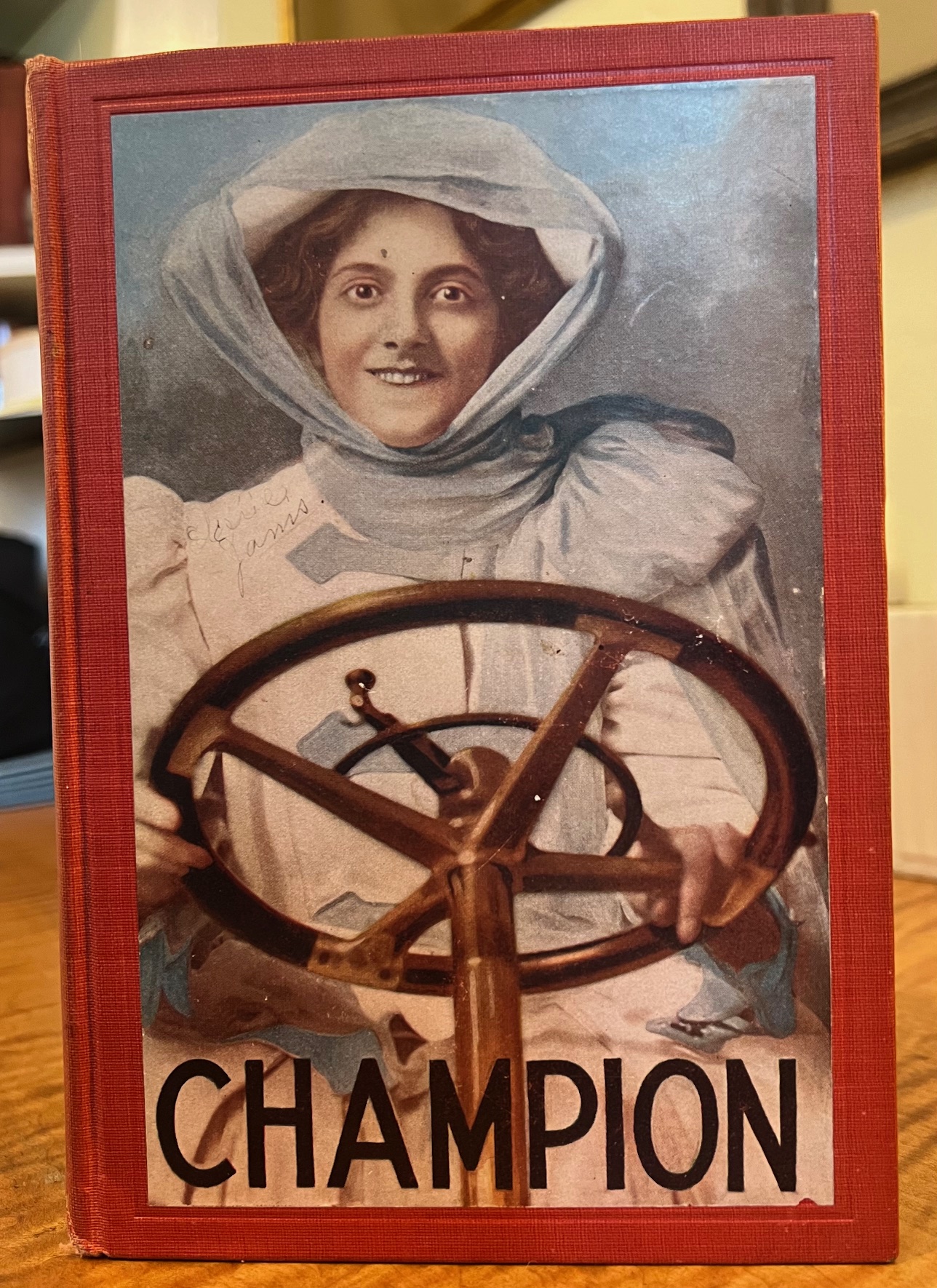 [from review in the the Spokesman-Review (Spokane, Washington) Sun, Sep 8, 1907] Hugh Cameron, a young Englishman of good birth, but bad income, takes all the money he has in the world, a small legacy from an uncle, and builds himself a motor car, which, if successful, will make his fortune. For it has an aeroplane attachment, which makes it as near a bird as anything built to stay on the ground can be. Champion it is baptized and a champion it proves, both in speed and heart, for the automobile itself tells the story of its own and its master's woes, with all the devoted blindness of a faithful servant for a kind master.