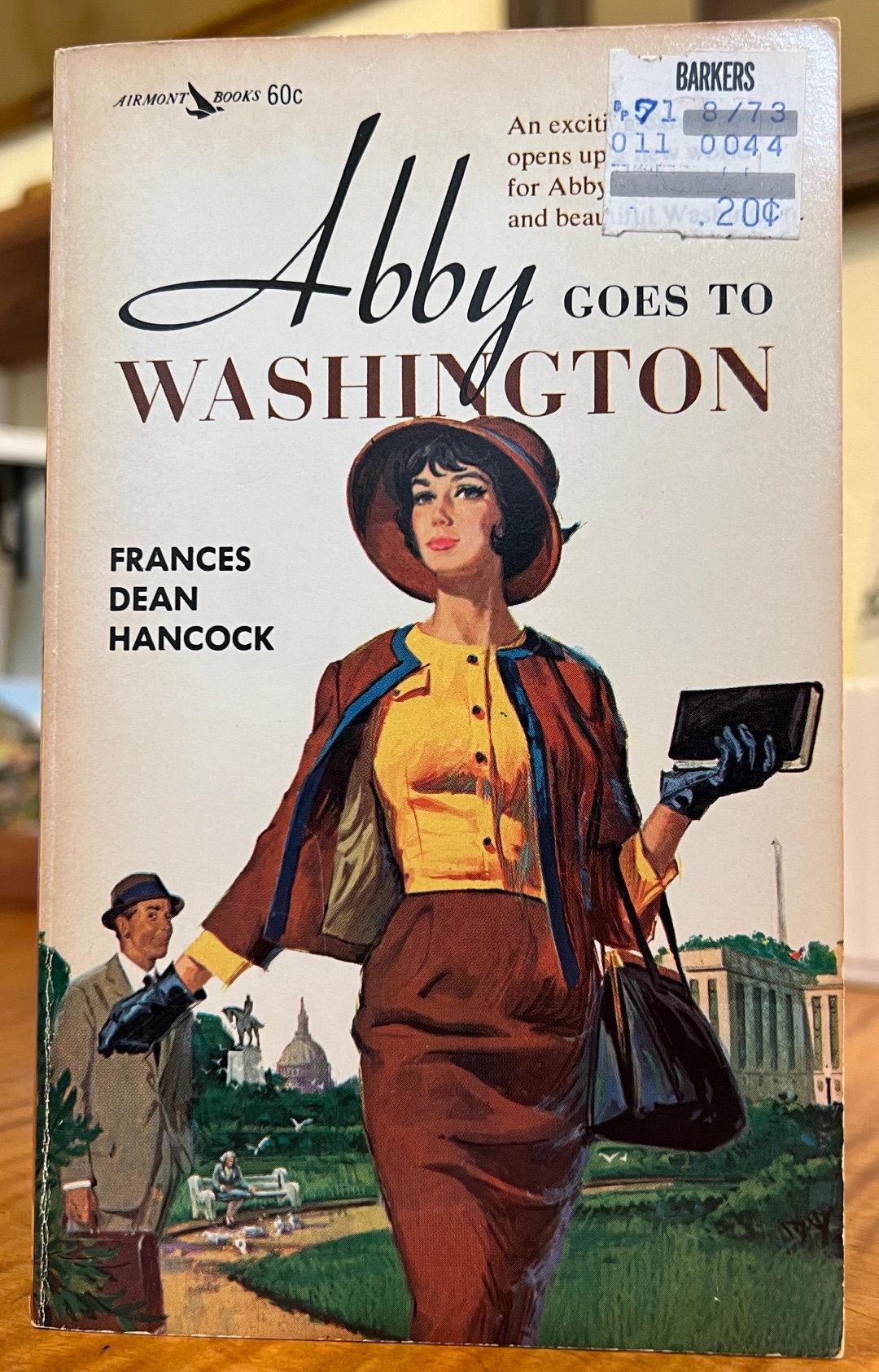 Abby Goes To Washington is very much what we would call "career porn" -- where young female readers were offered enticing, explicit (in the "very specific, clear, and detailed" sense of the term :D) descriptions of work life and the ins and outs, no pun intended, of a particular job/career path available to women. The most popular of this genre in the mid-century , were, running away, nurse and stewardess romances -- Judson wrote a number of those, too -- so it's nice to see such a departure in Abby's scientific work as a Food Technologist for the USDA's testing laboratory in Washington, DC. I actually learned a lot about how food testing operates -- the book opens with Abby "spread[ing] a ketchup sample on a Howard mold-counting chamber" (5) -- and what the USDA grading system is and does. I didn't know, for instance, that getting your product USDA graded was optional, but useful in securing, among other things, large public contracts, or that the inspections measured quality, whereas safety was the province of the FDA in their enforcement of the Pure Food and Drug Act (46) (thank you, Vintage Bookfinder-featured Samuel Hopkins Adams!). There's lots of interesting narrative about young women's lives in DC in the 50's -- where it seemed like everyone was trying to work -- or date -- their way up the power scale and where there were, according to Judson/Hancock, more women than men and most of the latter married, but still on the prowl (23). There's also a nice description of what would turn out to be the tail end of the Watergate concerts and, during Abby's weekend visits home, some (overly-affectionate) discussion of the insularity of Virginia country club society. The romance is really not much of anything but she does quote Jane Austen at him -- "...in the words of Mr. Collins..." (28) and he, Dickens -- "nice girl and nothing but it" (41) -- at her, so there's that. And Abby gets an informal promotion to on-site inspector, which is almost as satisfying as winning Jack (about whom she's remarkably clear-eyed: he's a good kid, but "still far from maturity" (53)). Mid-century-flavored sexism creeps in a bit but the only truly domineering personality is an old lady so on that metric it's not really bad at all.