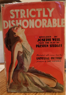 (from Grosset & Dunlap dustjacket) Novelized by Joseph Weil from the famous play by Preston Sturgis. When real love comes to a young girl anything may happen. "STRICTLY DISHONORABLE" is a story of what does happen. Isabelle Parry, beautiful Southern miss, laughs at love and suitors until Henry Green comes into her life. Perhaps she is dazzled by the idea of leaving her small town to live in the metropolis. At any rate, she says "Yes!" She is thrilled by her trip North to visit Henry's people. As a fitting climax to a whirlwind courtship, Henry takes Isabelle on her first rounds of New York night life. A few too many drinks in a Forty-ninth Street speakeasy makes him surly. He deserts his fiancee. The inexperienced girl is thrown upon the mercy of two strangers. For the first time in her life she pends the night in a man's apartment. The unusual romance of a famous play is charmingly disclosed in this finely written novel.